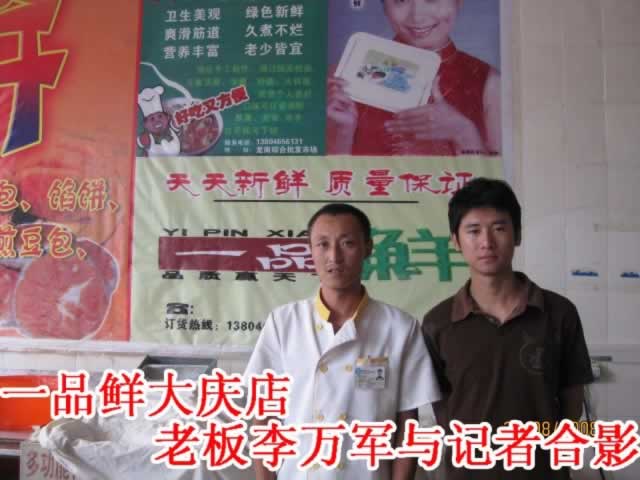 一品鮮的大慶加盟商名叫李萬軍,電話聯系得知,晚上五六點鐘是他店里忙的時候,所以沒讓他接站,我選擇只身前往。按著李萬軍提供的地址,我順利地找到了“一品鮮面條店”。不用自我介紹,我就知道眼前這個一身面粉,忙得頭不抬眼不睜的男人就是李萬軍。初次見面他也并不陌生,高興地對我說:“可把你等來了,你先坐一會兒,我忙完手頭的活再和你好好聊?!?