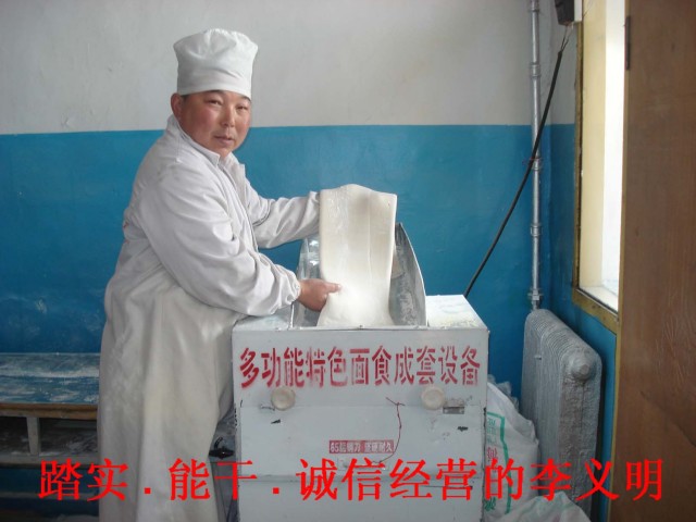 我有些外行地問他:“河南以拉面和燴面為主,東北以面條為主,一品鮮不是燴面機嗎,你是怎么讓王總改裝成面條機的?”李益明哈哈地笑了起來,他說:“這你就外行了吧,一品鮮的設備產面的樣式老多了,不同的模具可以制作出不同的面種,拉面、燴面、抻面、面條,都可以隨意操作,更換一種模具只需幾秒鐘的時間?!笨斓缴钜?,我不想打擾他的休息,因為李益明第二天很早就要起來干活。